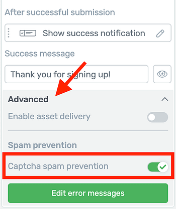 Once you are connected, edit any Thrive Themes form and under the advanced tab, you'll be able to enable Captcha spam prevention.