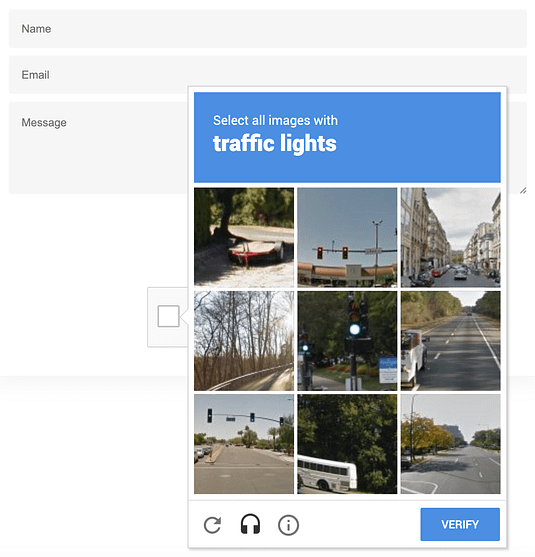 Then, when a visitor tries to submit your form, Google ReCaptcha will identify suspicious browser connections and will display an image picker just like this traffic lights test to prove if a visitor is a robot or not.