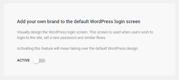 Hitting the ‘Manage Login Screen’ button opens the activation options for your WordPress login screen. Simply flip the toggle to override the default login screen and get started.